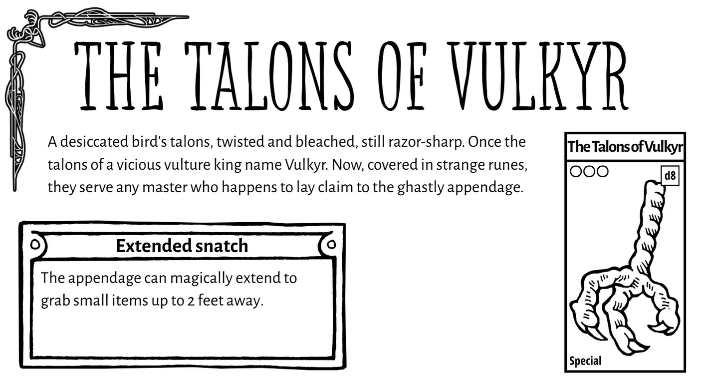 A desiccated bird’s talons, twisted and bleached, still razor-sharp. Once the talons of a vicious vulture king name Vulkyr. Now, covered in strange runes, they serve any master who happens to lay claim to the ghastly appendage.