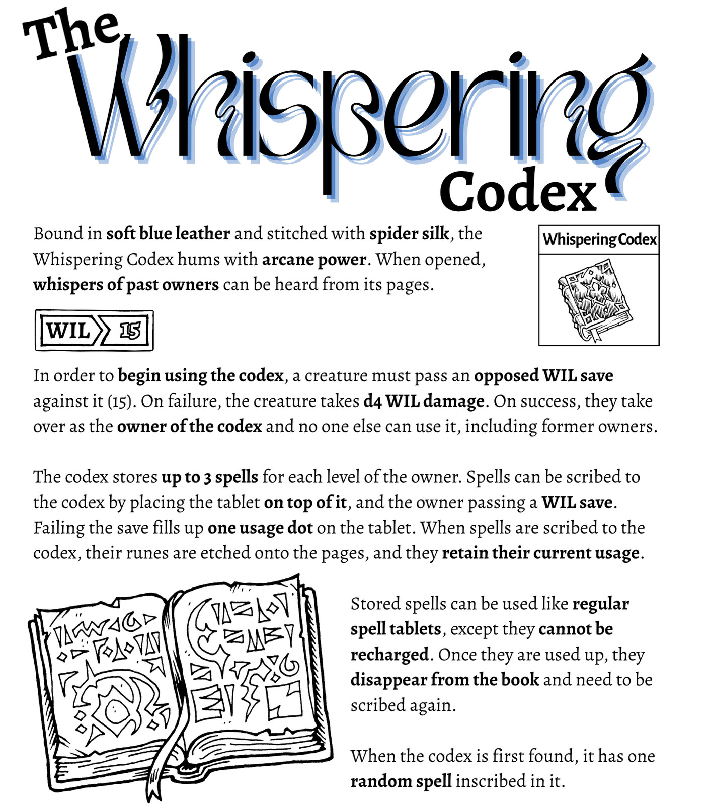 The Whispering Codex is a 1-slot item with a will of its own. It can hold many spells, but taking ownership of it is difficult and dangerous.