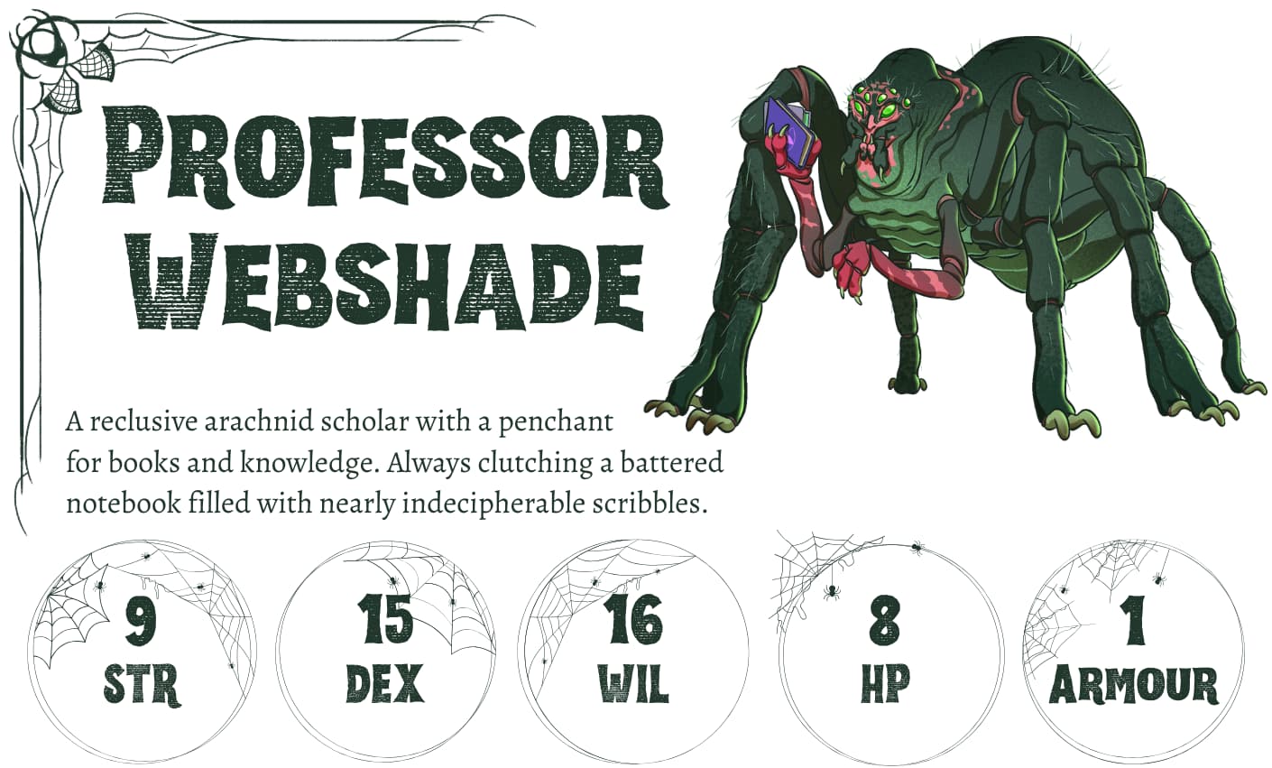Paying members can find the full character details here: Downloads for Role Call #6: Professor Webshade