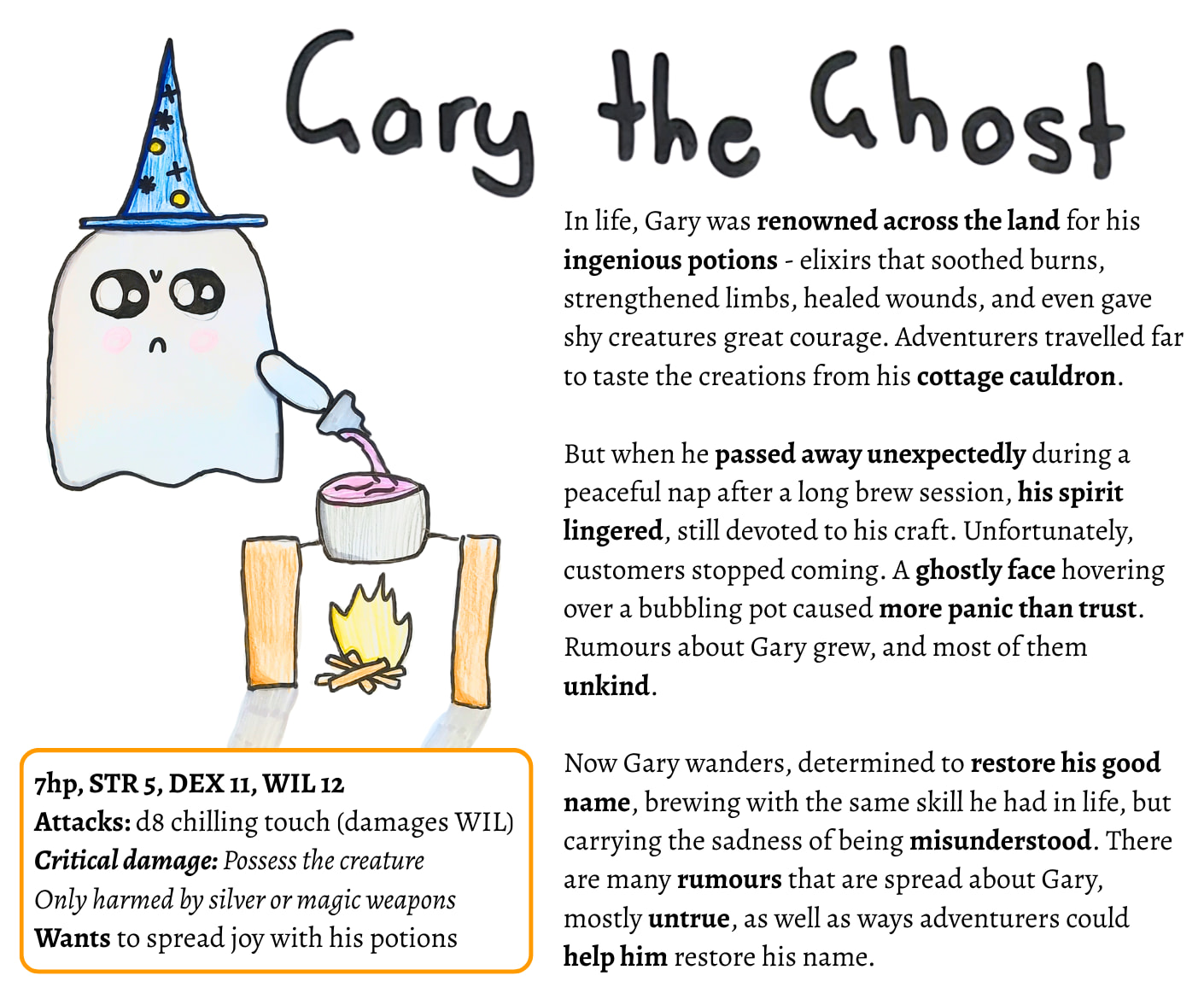 Gary is a ghost - once a potion maker by trade, he now continues to brew, but people no longer trust his ghostly form. All he wants is to brew potions that make others happy, seeking to restore his good name so he can get back to what he loves.