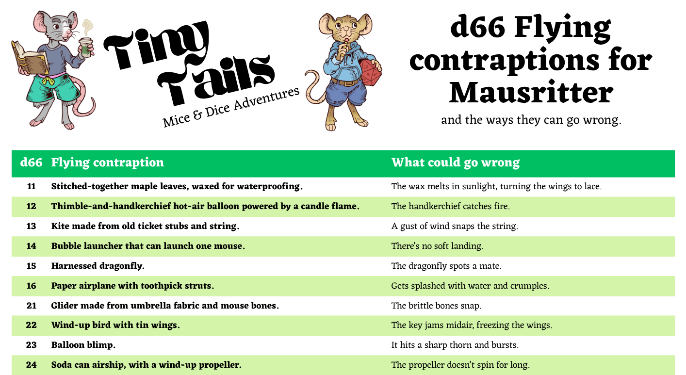 Paying members can download the full table here: Tiny Tables #11: d66 Flying contraptions for Mausritter [Full table]